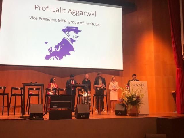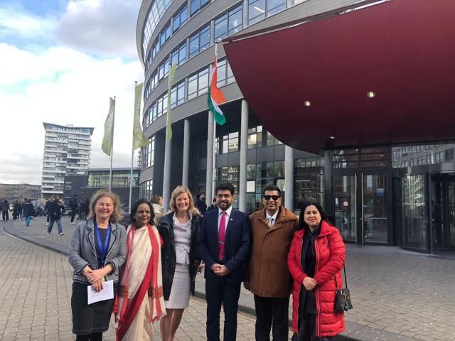 In front of THUAS with part of the Indian Delegation -and the Vice-Ambassador of India in The Hague, Mr. Mattam. From left to right: Refiya Scheltinga, International Relations officer European Studies Programme; Nutan Bharati, Professor at Management Education & Research Institute (MERI), New Delhi; Margriet Krijtenburg, PhD on Schuman’s Europe & senior lecturer European Studies Programme; Mr. Gince Kuruvilla Mattam, Vice-Ambassador India, Lalit Aggarwal, Professor & Vice-President MERI; Mamta Aggarwal, Head primary & secondary school(s) New Delhi.