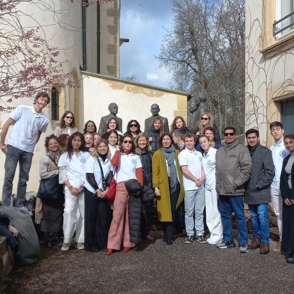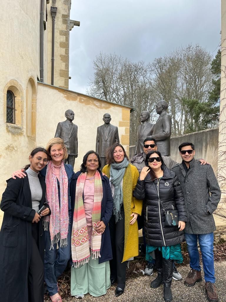 COIL-travel group in Scy Chazelles in front of the little church where Schuman was buried and the statues of the first Founding Fathers of the European integration project (Schuman, Adenauer, De Gasperi and Monnet)